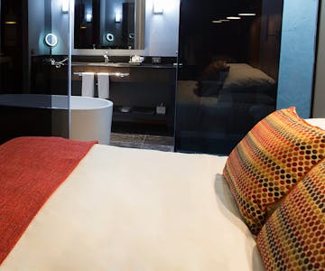 Moderna habitación con cama king size y espacio para 2 personas máximo, con Smart TV, tocador y silla, clóset y baño completo con tina.