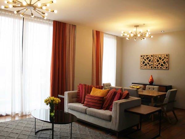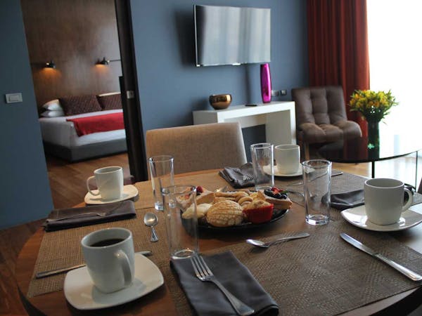 This Presidential suite is widely distributed with a television area, equipped with a minibar, a love seat, Smart TV, as well as a 1/2 bathroom at the entrance. Similarly, it has a dining room for 6 people in which you can enjoy your meals in the comfort of your room. The suite is privileged with a beautiful view of the area as it has a terrace. It has 2 bedrooms, The main room consists of a king size bed, desk, Smart TV, private bathroom with double sink, tub, shower area and a large walk-in closet. The second room has the facility to have independent access if necessary. It is equipped with two Queen size beds, Smart TV, closet, bathroom with double sink, tub and shower area. The two rooms are accompanied by luxury amenities as well as their complementary accessories.