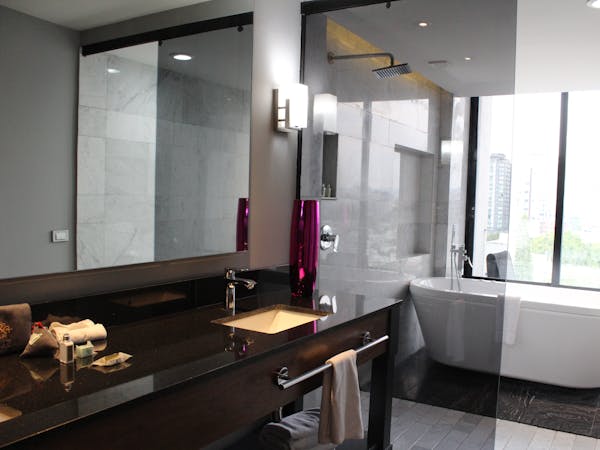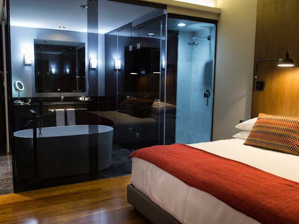 Style meets comfort in this Master Suite for 2 people, with king size bed and balcony. Features living room, desk and work chair, sofa, Smart TV, closet, one full bathroom, bathtub and another half bath.