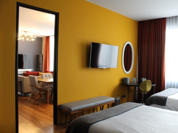 Spacious and contemporary-style room, equipped with 2 double beds to sleep 4 people. Features full bathroom, closet, Smart TV, dresser and chair.