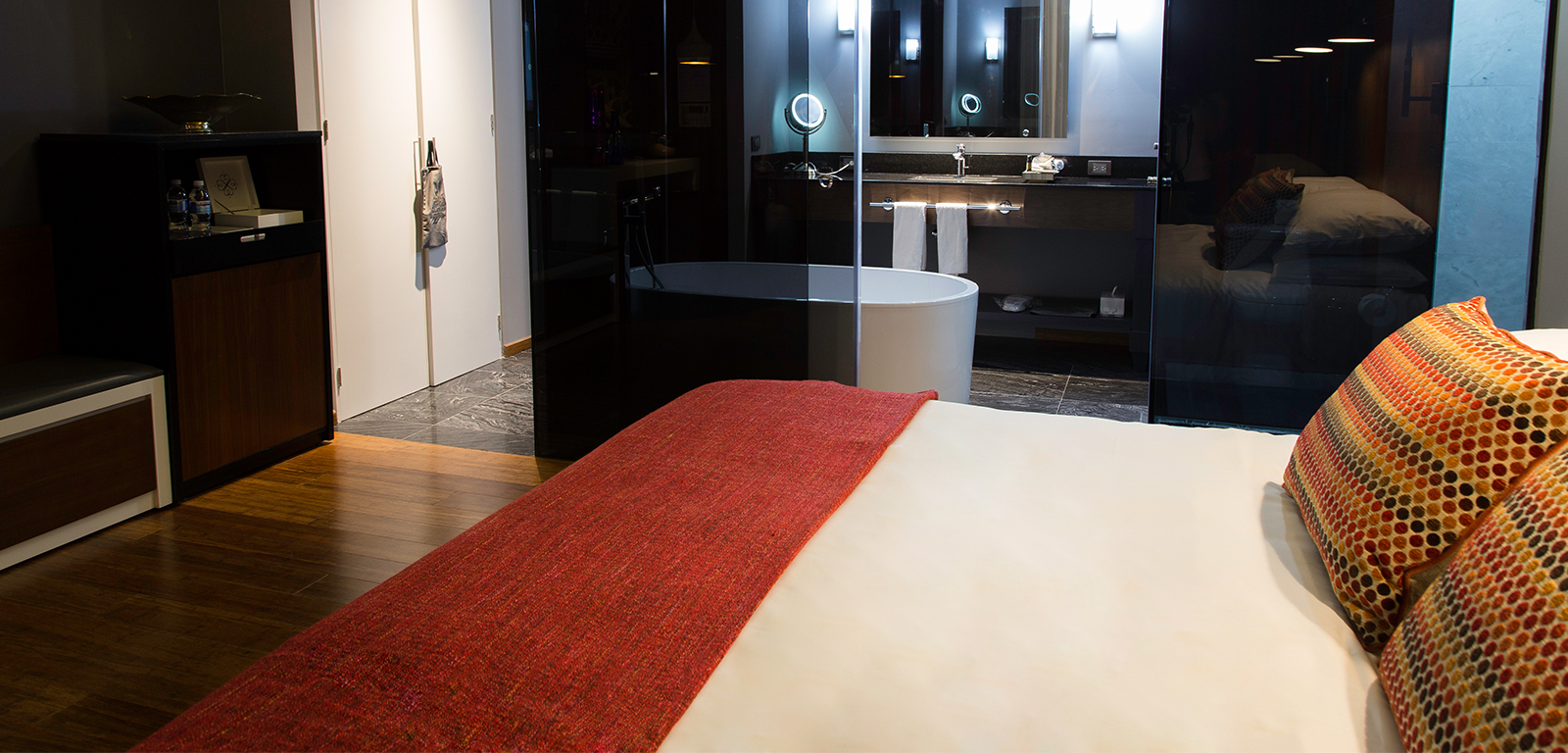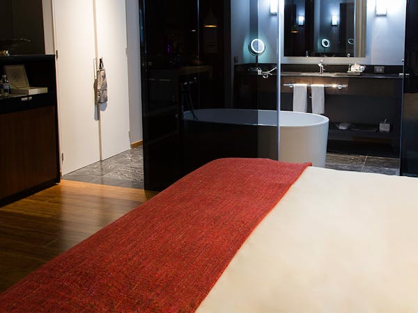 Elegant and spacious Junior Suite for 2 people, with living room with sofa bed and dining table and a bedroom with king size bed. It’s equipped with Smart TV, dresser and work table and chair, closet and full bathroom with bathtub and another half bath.
